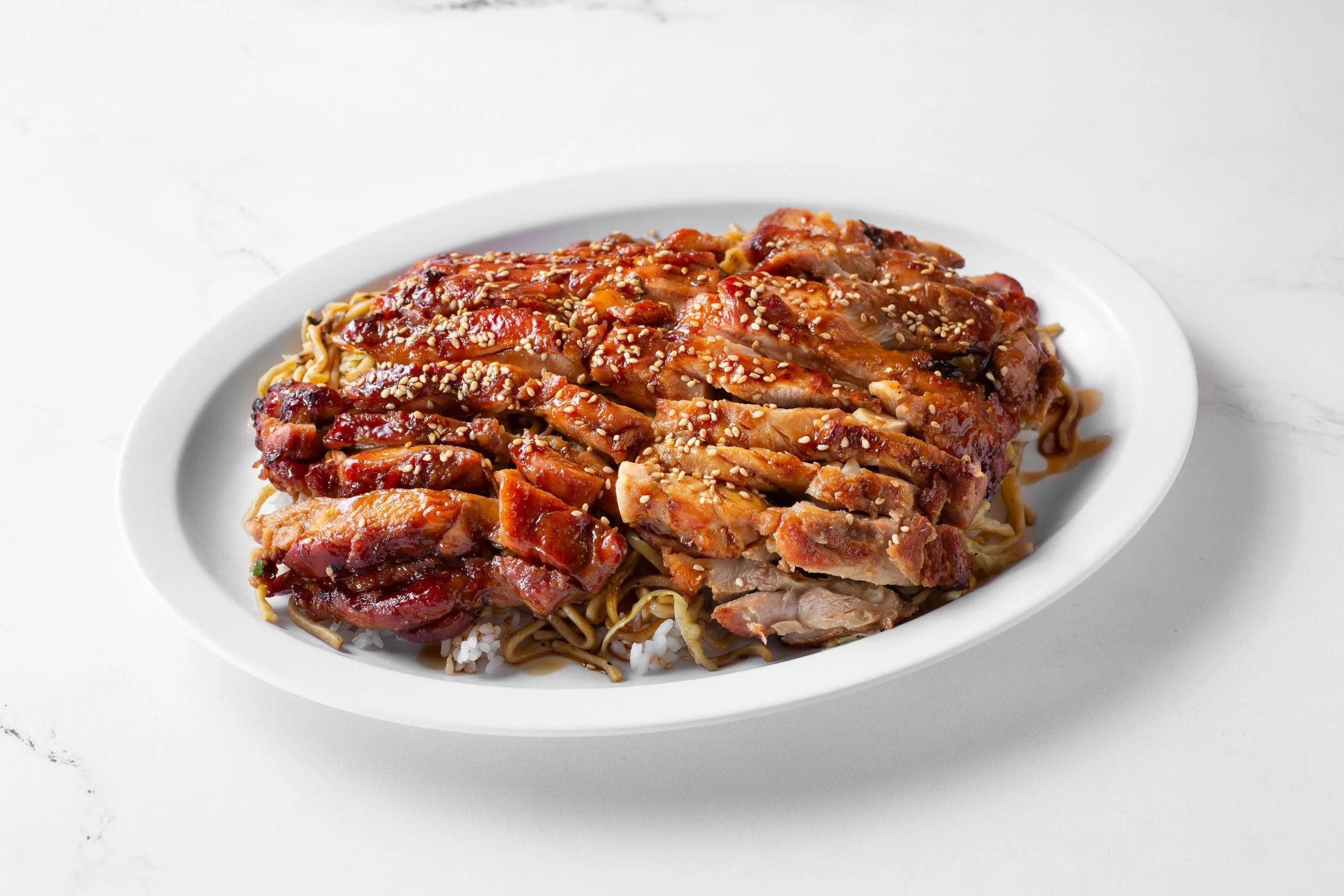 Marinated Teriyaki Chicken over rice and chow-mein. Includes drink, available in Small and Large.