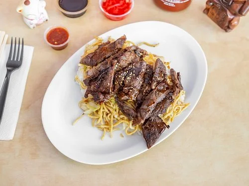 Marinated Teriyaki Beef over rice and chow-mein. Includes Drink available in Small and Large.